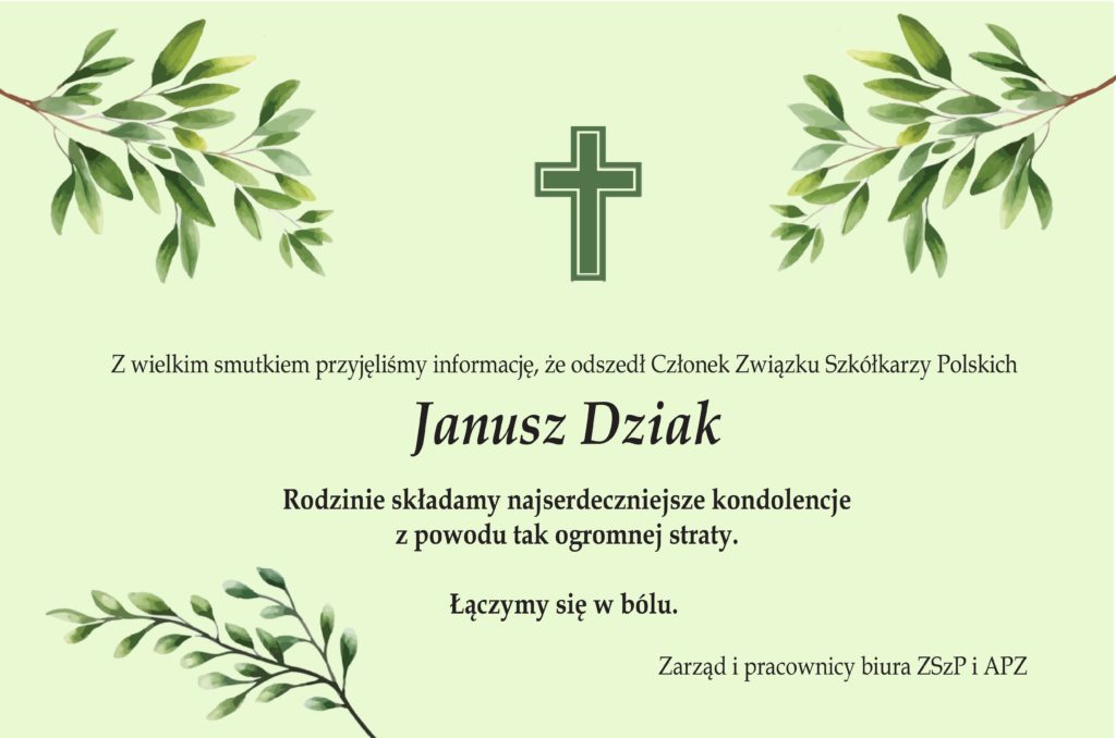 Z wielkim smutkiem pożegnaliśmy 23 marca 2024 roku naszego Kolegę śp. Janusza Dziaka, współwłaściciela Szkółki Drzew i Krzewów Ozdobnych Renata i Janusz Dziak z Tyczyna w woj. podkarpackim.